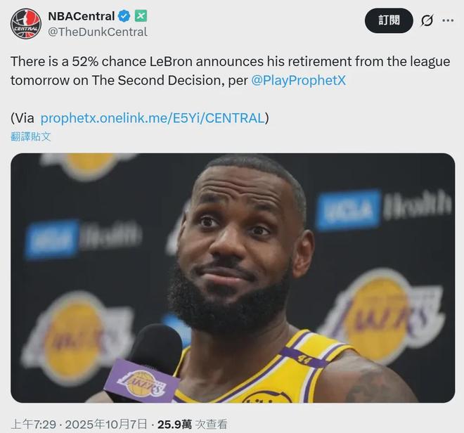 对此,美国顶级体育预测市场Prophet X做出了判断,他们预测詹姆斯在今天凌晨宣布退役消息的概率为52%。