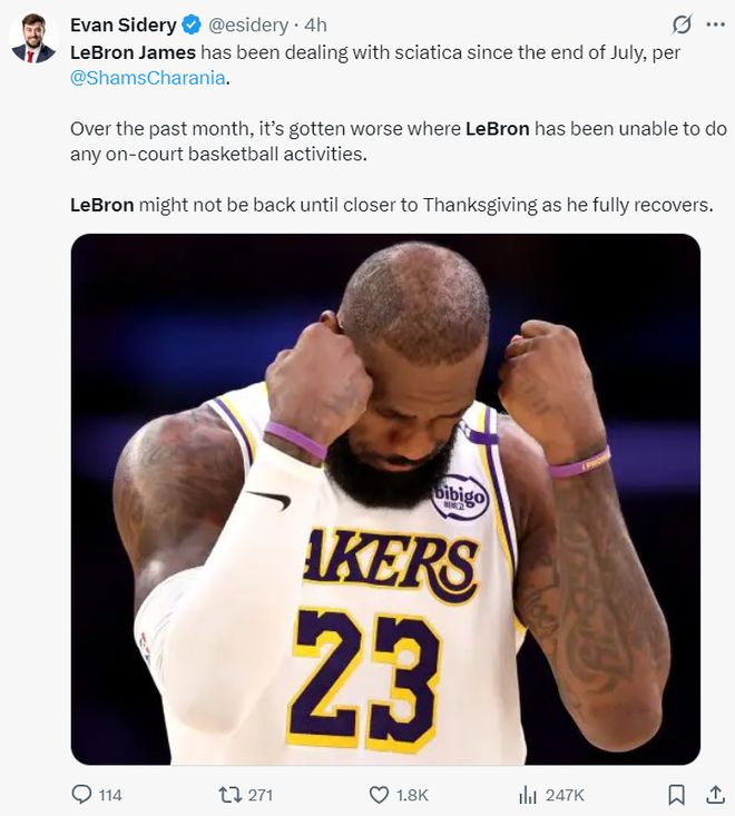 Shams还在播客节目中说道:在过去一个月里詹姆斯的坐骨神经痛变得更加糟糕,勒布朗已经无法进行任何的篮球训练,勒布朗可能要感恩节前后才会回归赛场,他还需要一段时间来康复,比如恢复体型、维持训练强度等等。