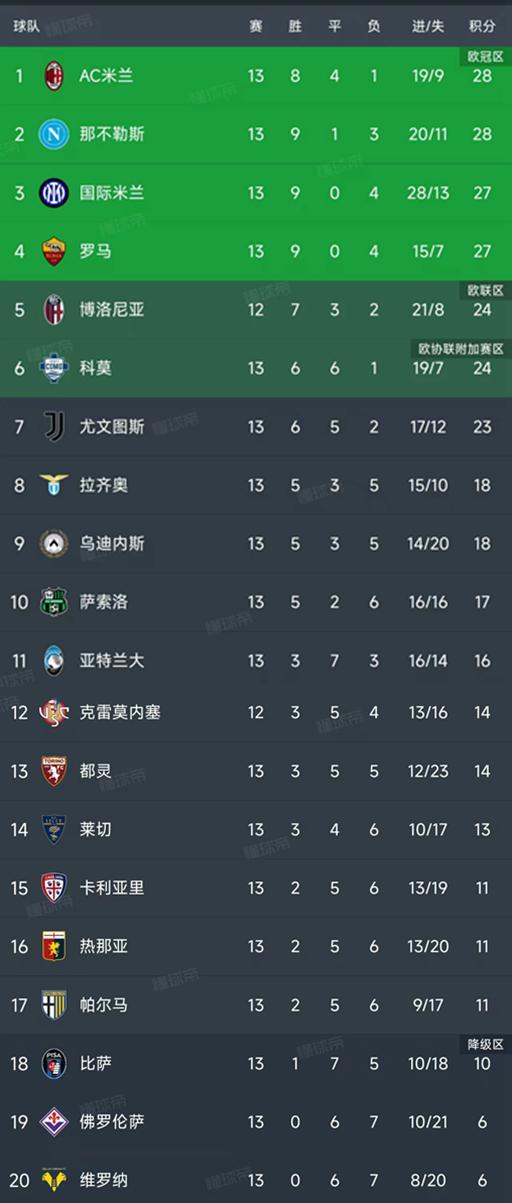 意甲第13轮结束了9场比赛,最新积分榜如下!